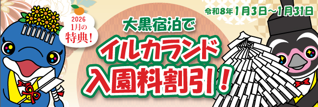 2026年1月限定の宿泊者特典として、イルカランドの入園料が …