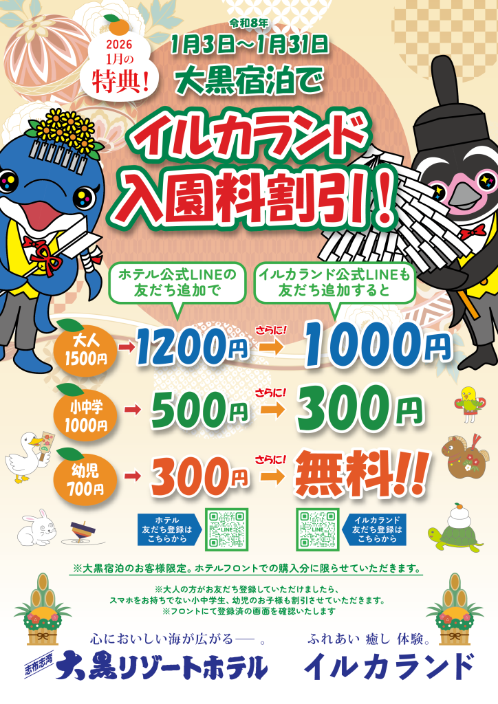 大黒リゾートホテルにご宿泊のお客様は、ホテル公式LINEへの友だち登録で入園料が割引となり、さらにイルカランド公式LINEにもご登録いただくことで、よりお得な料金でご利用いただけます。